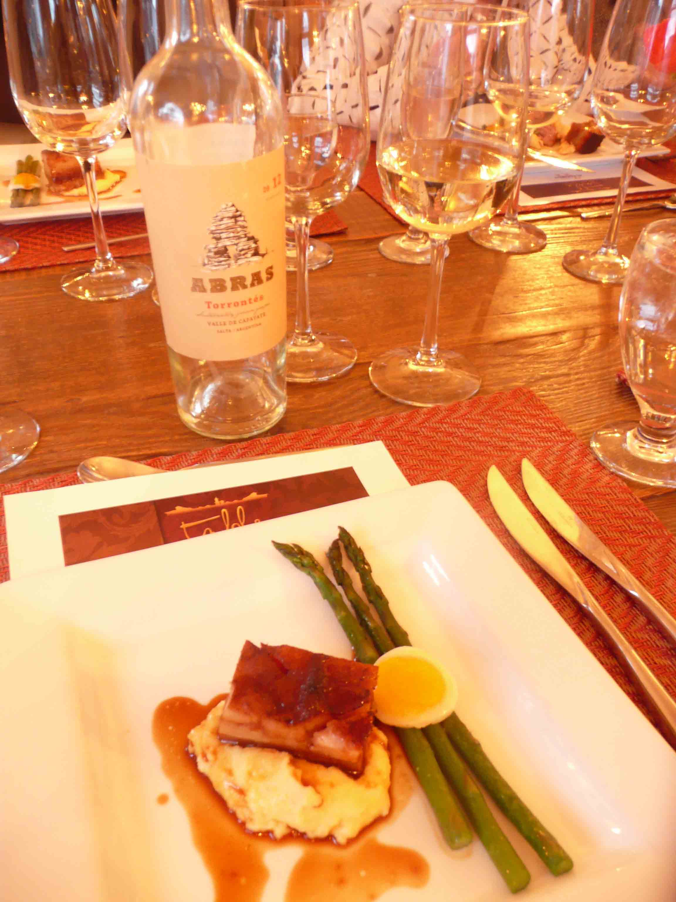 Second Course – Pork Belly, Sunnyside Up Quail Egg, Asparagus, and a Ginger-Soy Reduction over Soft Polenta, paired with Abras Torrontés 2011. Hosea introduced the course as “bacon and eggs.” He makes an especially succulent pork belly. When paired with asparagus and eggs, it had the feel of a preview of Easter Brunch. The wine was light and refreshing, with honeysuckle in the bouquet.