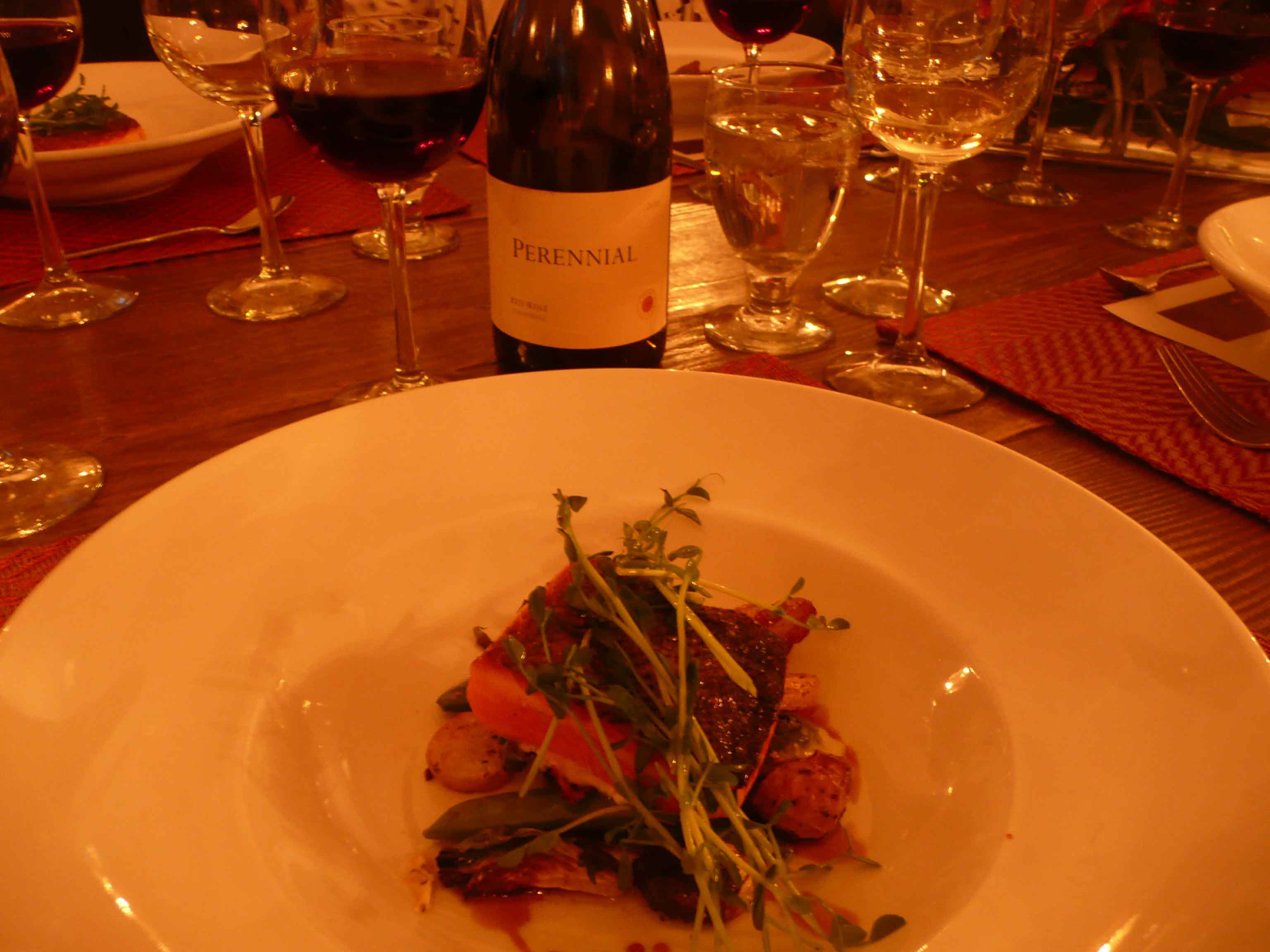 Third Course – Crispy Skin Salmon, Fingerling Potatoes, Brussels Sprouts, Peas, with a Pomegranate-Brown Butter Sauce. Hosea referred to salmon skin as “bacon of the sea,” and advised that all health-conscious foodies will want to eat this part of the salmon because it has the highest concentration of EFAs. To make it even healthier, it was paired with Flowers Perennial 2011, a juicy red blend of 48% Pinot Noir, 44% Syrah, 4% Pinot Muenier, 3% Dolcetto, and 1% Chardonnay. Not an empty plate in the house.