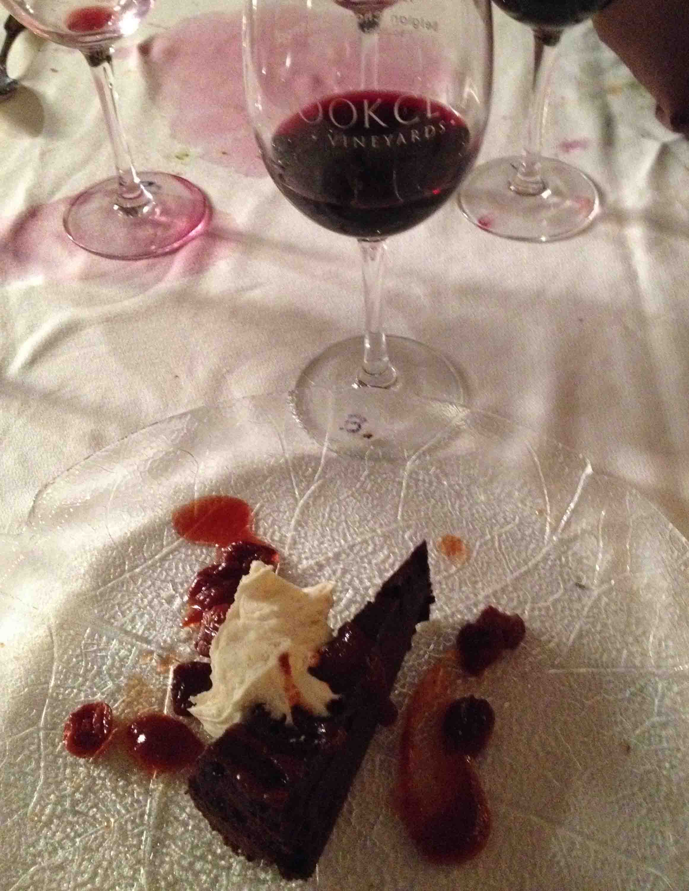 Fifth Course: Souzao port-style wine paired with Chocolate Torte with Candied Cherries. This rich dessert punctuated the evening nicely. The Portuguese grapes in the wine were a natural fit with the chocolate. Irresistible.
