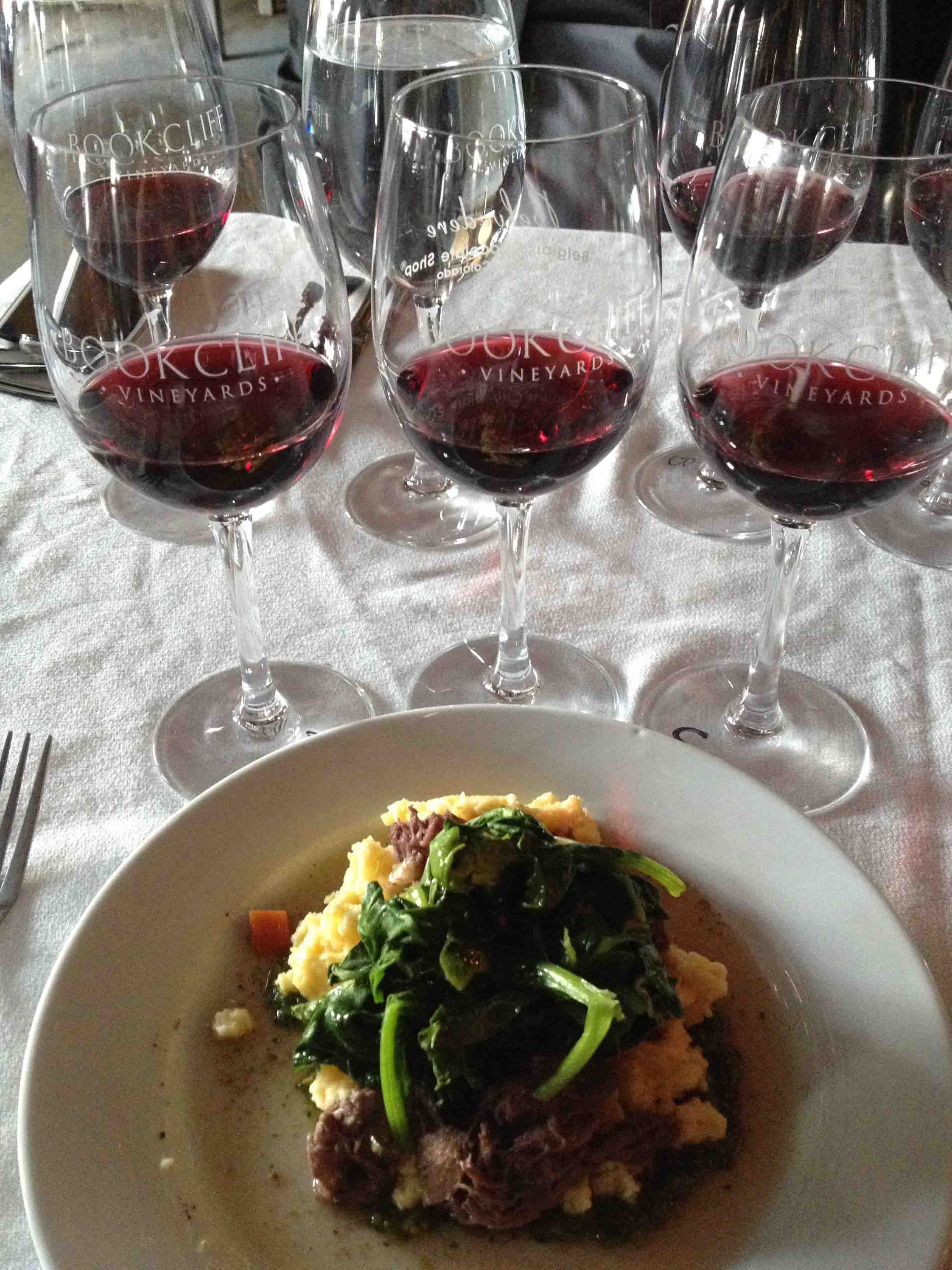 Second Course: Three samples of 2012 Cabernet Franc paired with Pork Ragu and Polenta with Green Peppercorn Sauce. The samples came from the same block in the same vineyard. The first sample was aged in American Oak with grooved staves, while the second and third samples were aged in French Oak by two different coopers. The group had fun comparing samples and tasting the effects of different oaks on the wine. The luscious fruit qualities shone with the pairing with the braised pork and spinach and creamy polenta. John encouraged those with any wine left in their glasses to mix them into one to create a red blend.