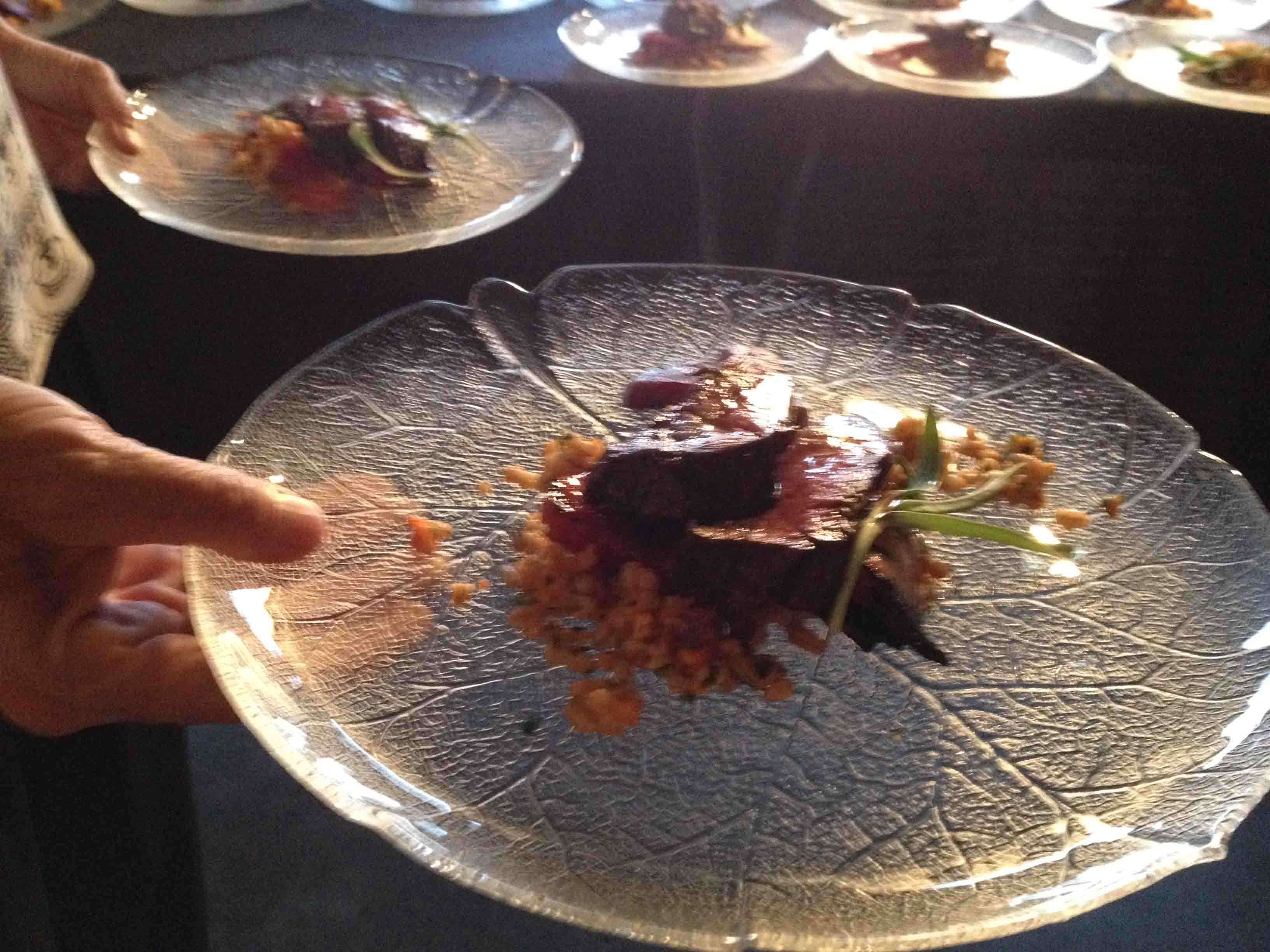 Third Course: Two samples of 2012 Cabernet Sauvignon paired with Beef Tenderloin and Grilled Beets with Red Wine Sauce. Cabernet Sauvignon is the last grape to be picked, and needs the most time on the vine. The two samples were aged in different types of French Oak. John described how to blend the two samples as diners enjoyed faro salad with stridolo.
