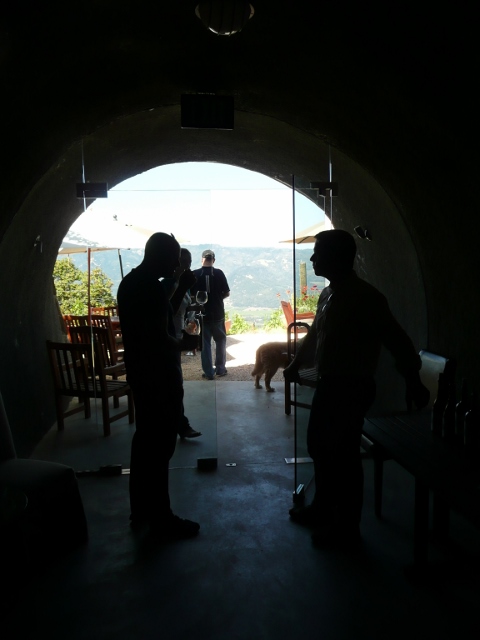 The winery is located in the Spring Mountain District on the ridge of the mountain that separates Napa Valley from Sonoma Valley. The logistics of operating a hilltop winery – at an elevation of 2,000 feet – require terraced vineyards, some of which were planted on 45-degree slopes. In order to tend the vines, the vineyard crew must have some acrobatic ability. While we may have hoped to see people out on the steep slopes, on the day of our visit the work being done at the winery had more do to with constructing a solar-powered building than farming the vineyard.