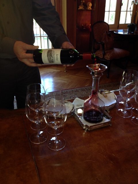 We climbed the stairs to the library, where we gathered to watch Blakley decant a 2002 Jordan Cabernet Sauvignon. Blakley explained Jordan’s Left-Bank style Cabernet must always contain at least 75% Cabernet Sauvignon in order to be labeled a Cabernet. Jordan Cabernets tend to be blended with 1-2% Malbec, anywhere from 12-23% Merlot, and the balance Petit Verdot.