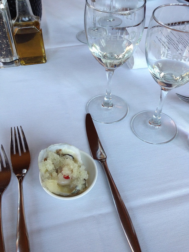 The Sauvignon Blanc was crisp and citrusy with high acid. The Equilibrium blend of 72% Sauvignon Blanc, 17% Chardonnay, and 11% Muscat was much softer. While the group was divided, my preferences were to pair the simpler Sauvignon Blanc with the oyster and sip the Equilibrium on its own before dinner. Sauvignon Blanc matched the acidity, creating balance. The cold, refreshing Sauvignon Blanc cooled the surprising heat of the slice of pepper.