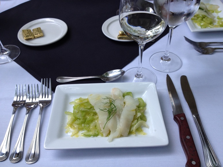 Cleveland welcomed diners by introducing her new white blend of 97% Sauvignon Blanc and 3% Viognier. The wine is light and brisk with good acidity, which stood up well to the raw fish “cooked” in olive oil and citrus. The Viognier in the blend softened the astringency of the Sauvignon Blanc, and was a good complement to the buttery quality of the fish. The celery added a tasty crunch.