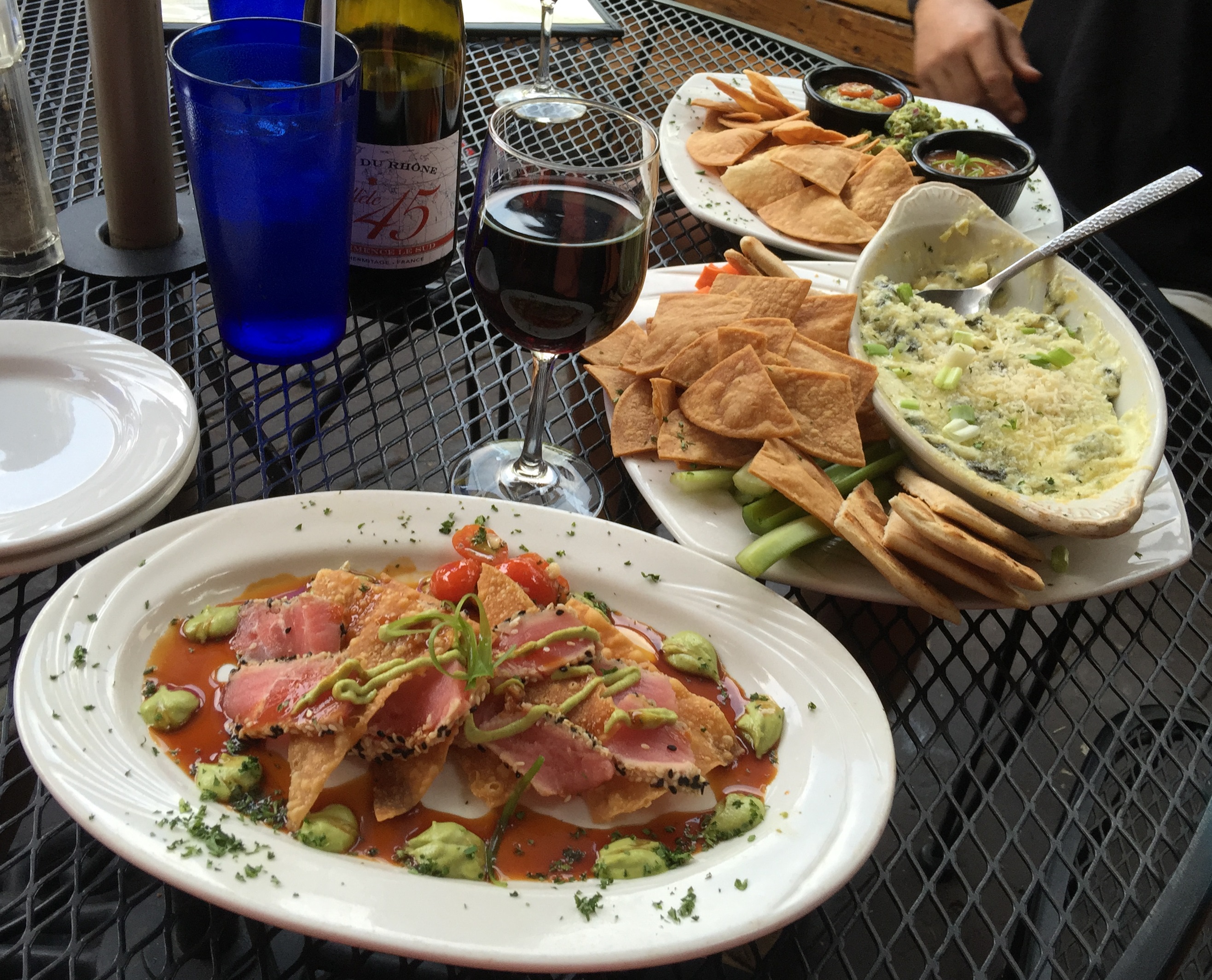 As for the food, four words: Sesame Encrusted Ahi Tuna. Seared rare and served with wasabi aioli, teriyaki reduction, and won ton crisps, this was an amazing way to begin dinner. The blend of flavors and textures was inhaled by our table. We thought about ordering another, but were distracted by other appetizers, including housemade Asiago Spinach and Artichoke Dip and a Guacamole and Salsa Sampler.